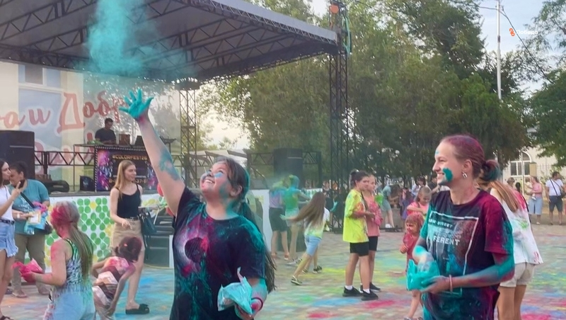 После спортивно-игровой программы семьи отправились дальше праздновать. Дети играли с цветными красками Холи.