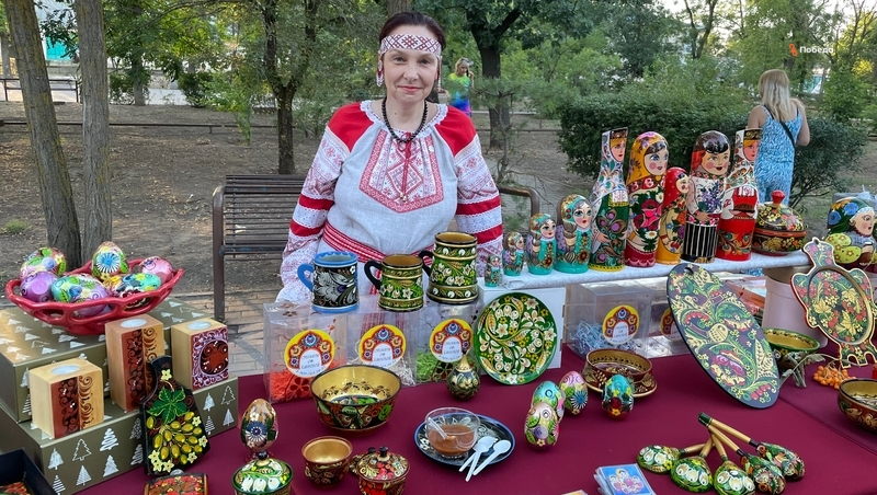 Гости фестиваля также могли купить сувениры, символизирующие русскую культуру. На фестивале свои работы продемонстрировала Елена Хлыбова из Будённовска. Более 30 лет она занимается росписью по дереву в стиле хохломы.