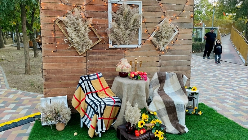 Недалеко от основной сцены была расположена уютная фотозона, оформленная в стиле гостеприимной бабушкиной гостиной. На небольшом столе стояли свежие фрукты, а рядом – мягкие стулья и лампа, создавая тёплую и уютную атмосферу.