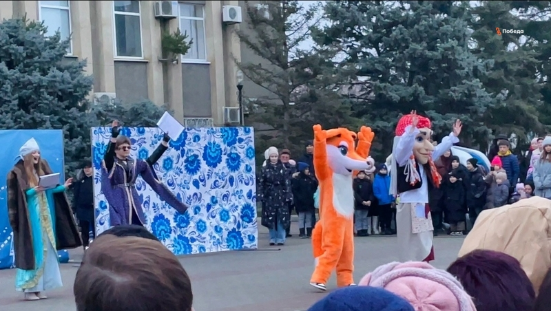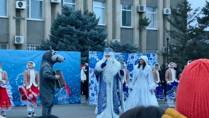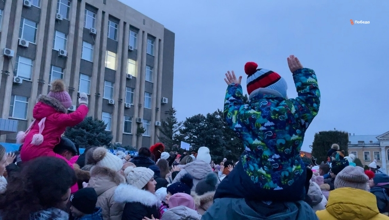 На центральной площади города у новогодней ёлки собрались дети и взрослые. Праздничное мероприятие открыли ведущие — Иван-царевич и Василиса Прекрасная.