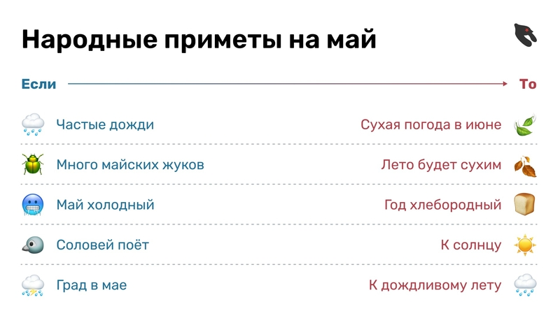 Дожди прогнозируются на 2, 3, 7, 8, 9, 10, 13, 19 и 31 числа. Солнечные дни предполагаются 12, 15, 16, 17, 18, 20, 21, 22, 23, 24 и 30 мая.