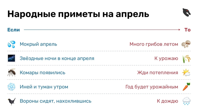 Во втором месяце весны количество солнечных и пасмурных дней практически сравняется. Дожди предсказываются на 2, 8, 9, 13, 16, 21, 23, 24 и 25 числа. Солнечные дни будут 1, 3, 4, 5, 6, 7, 17, 26, 27, 28 и 29 апреля.