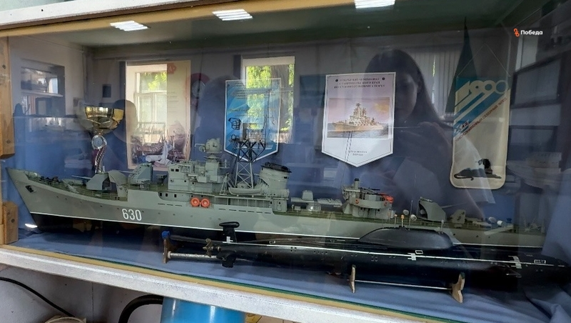 А дальше моделист совершенствует свой навык и собирает более сложные образцы. Например, в зале находится собранная модель эсминца «Эскадренный миноносец», который собирал педагог Александр Кондрашин.