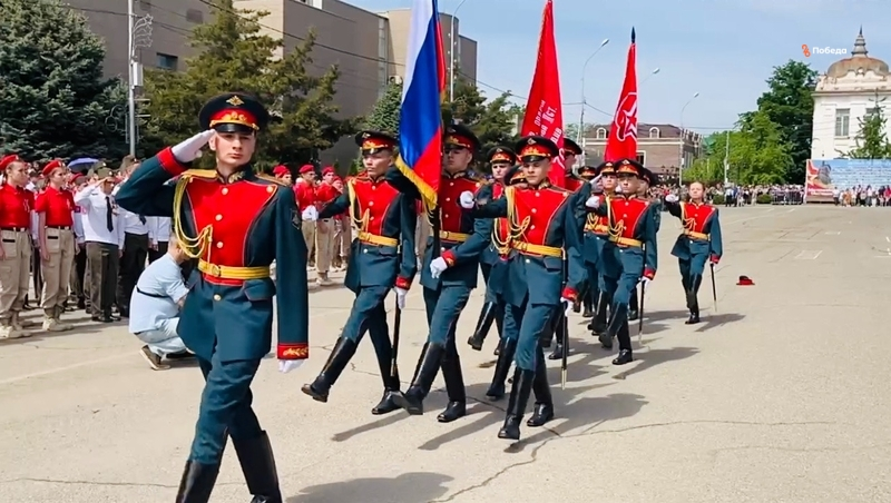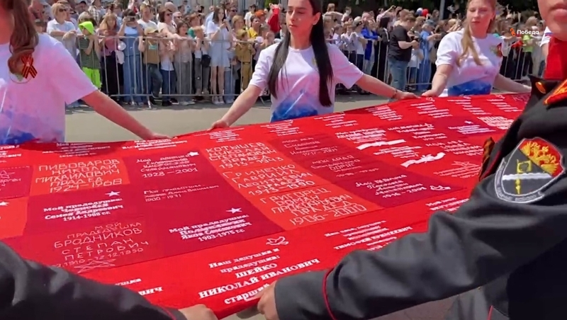 Все присутствующие на площади вместе исполнили песню «День Победы». После волонтёры прошли по центральной площади с «Полотном памяти». Этот алый холст уже пять лет остаётся важнейшим символом Дня Победы в Будённовске.
