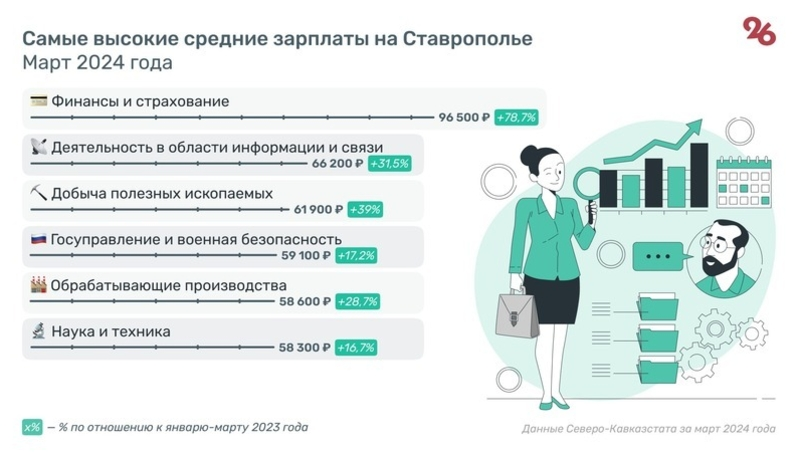 Согласно данным отделения Росстата по СКФО, средняя номинальная начисленная зарплата в регионе в I квартале 2024 года составила 50,5 тыс. рублей. Это на 18,3% больше, чем в аналогичном периоде предыдущего года. Расчёты проводились с учётом всех отраслей экономики, включая субъекты малого предпринимательства. Сферы, где зафиксировали самые высокие доходы, представлены в инфографике «Победы26».