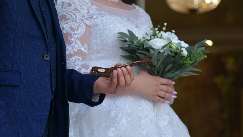 Главными героями события стала молодая пара — Елизавета и Евгений Колесниковы. Их поздравили супруги Зиновьевы, прожившие в браке почти 50 лет и готовящиеся отметить золотую свадьбу в 2025 году. Зиновьевы передали молодожёнам деревянный ключ как символ разрешения проблем и преодоления трудностей на пути к семейному счастью.