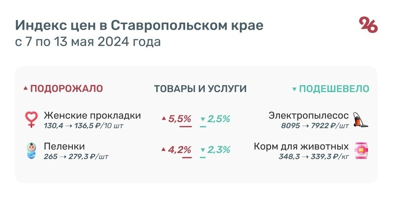 В категории непродовольственных товаров и услуг зафиксирован рост цен на женские прокладки – 136,5 руб. за 10 шт. Кроме того, произошло подорожание пеленок для новорожденных на 4,2% – 279,3 руб.