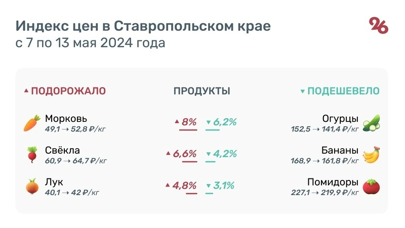 За неделю на Ставрополье существенно выросли цены на овощи. Морковь подорожала на 8% до 52,8 руб/кг, свекла на 6,3% до 64,7 руб/кг, лук на 4,8% до 42 руб/кг, капуста на 4% до 43,5 руб/кг, картофель на 2,7% до 38,7 руб/кг.