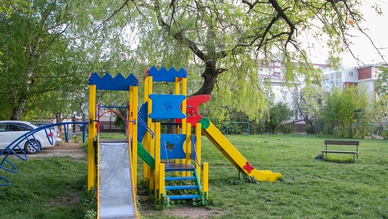 Территорию площадки снабдили специальным резиновым покрытием, установили домики, горку, балансир и качели.