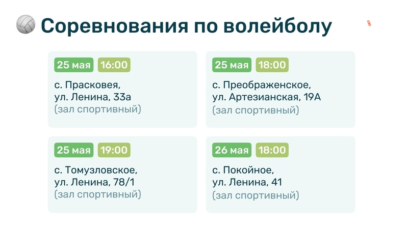 25 и 26 мая, в субботу и в воскресенье, прикумчане в возрасте от 14 лет и старше могут принять участие в спортивном празднике, который посвящён Дню соседей. Расписание матчей по волейболу представлено в таблице.